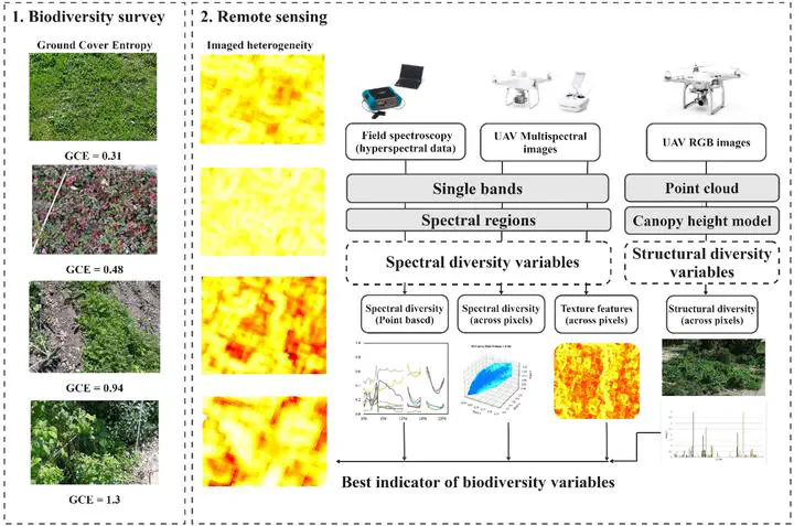 Our study, led by Yasamin Afrasiabian in collaboration with researchers from Technical University of Munich and Leiden University, demonstrates how combining drone-based multispectral imagery, in situ hyperspectral measurements, and 3D canopy height models can effectively capture plant and ground cover diversity.